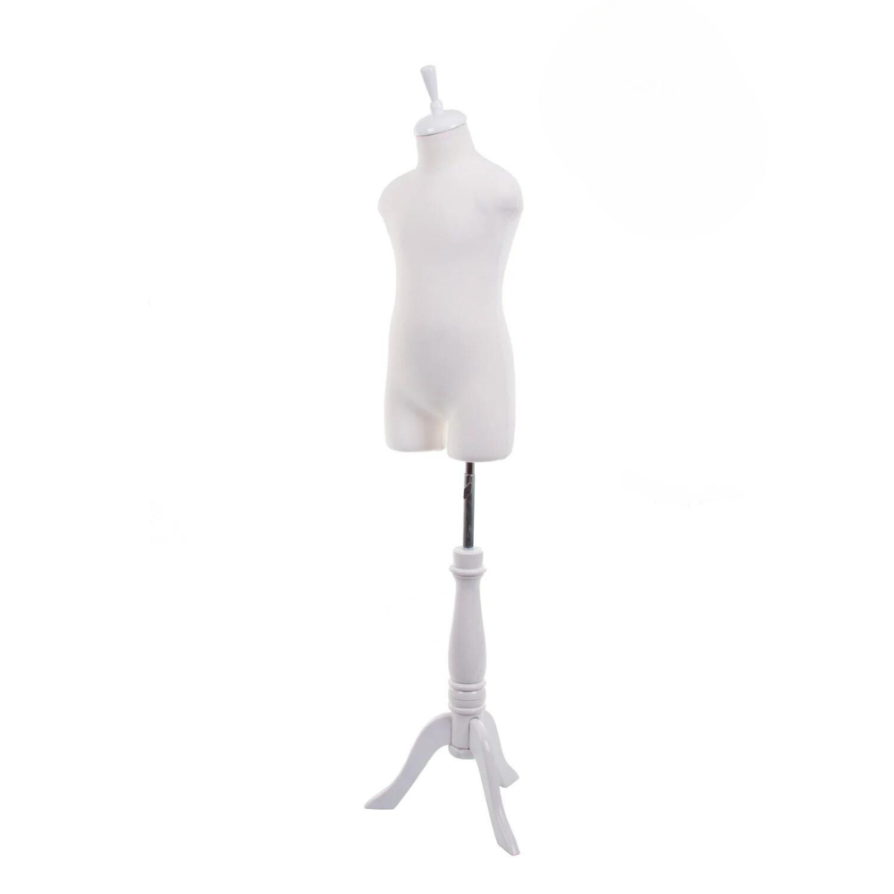 Manechin de croitorie pentru copil vârsta 9-10 ani, bust alb, picior trepied din lemn alb
